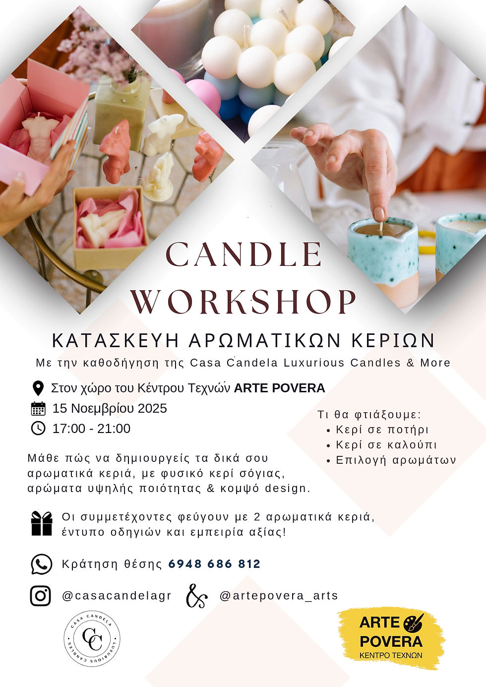 Ο χώρος του Arte Povera ανοίγει τις πόρτες του για ένα μονοήμερο, δημιουργικό ταξίδι στον κόσμο της κεροποιίας. Σας προσκαλούμε σε ένα ολοκληρωμένο workshop για να ανακαλύψετε την τέχνη της κατασκευής αρωματικών κεριών με τη χρήση αγνών και φυσικών υλικών.
